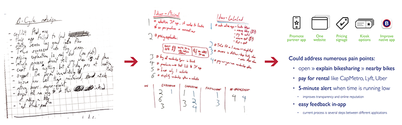 After some peer review, we organized our design recommendations into easily digestible categories. Despite it not being part of our assignment, I also took the initiative to polish our results, rally my team, and present these designs to the director of Austin B-cycle.