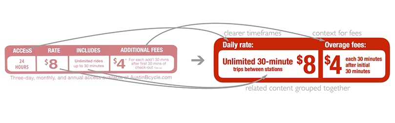 Retrospective: This project actually begin as a simple, one-day "design blitz" type of exercise. But I saw value in our findings, and suggested that my team polish them and present them to B-cycle. As a result, a variation on our pricing signage is being rolled out soon, and I've been looped into the pilot program for their new mobile app. It's wonderful to see our insights put to use and helping get people involved in active transportation like cycling, instead of being bottled up in a design studio. It's this kind of impact that makes me excited about the power of experience design.