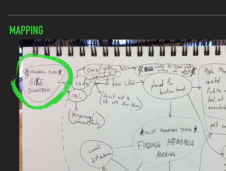 The initial problem my user stated wasn't related to cycling at all — it was a frustration with finding parking downtown. Probing further during interviews revealed that she only switched to driving after being forced to abandon cycling, due to safety concerns.