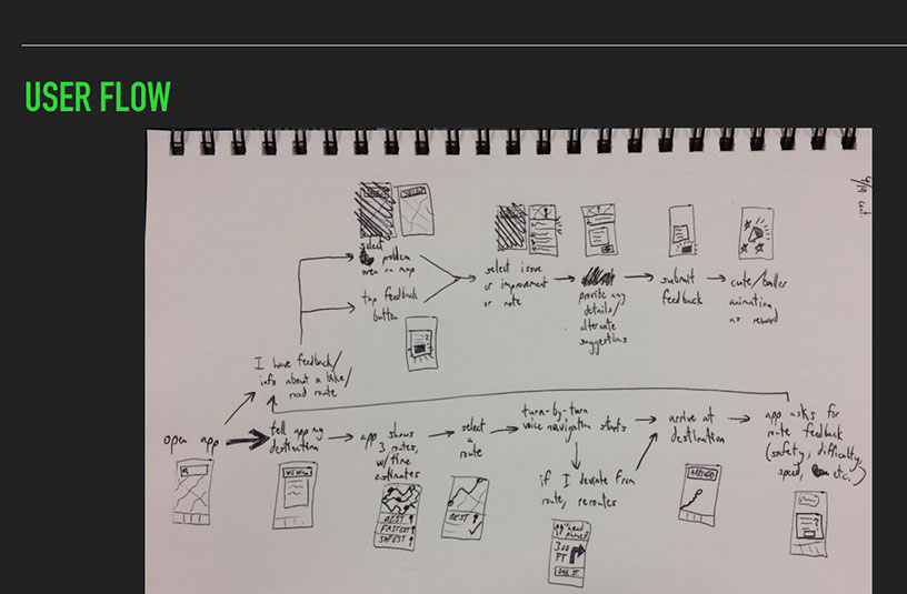 I tested a few variations of a navigation app that guided a cyclist away from dangerous areas and toward safer ones. This data would come from other users of the app, much like users can report qualitative tips in Waze. My user explicitly said that if a real person were being held accountable for their tips, she would provide feedback more herself.