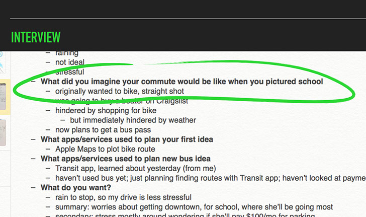Interviews with my user dug into her motivations: Why did she want to bike initially? What made her abandon that plan? What trade-offs would she be willing to accommodate in order to have this safer experience?