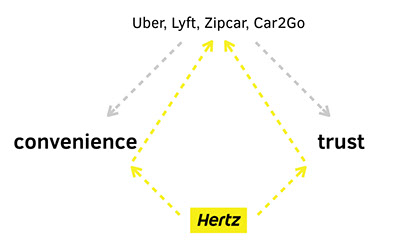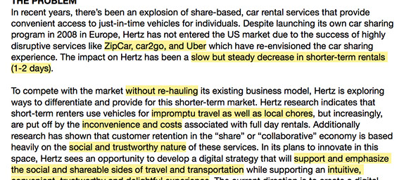 Problem: Hertz saw a decrease in short-term rentals due to the rise of new transportation services like Uber, Zipcar, and Car2Go.