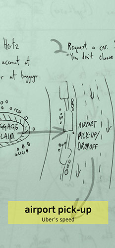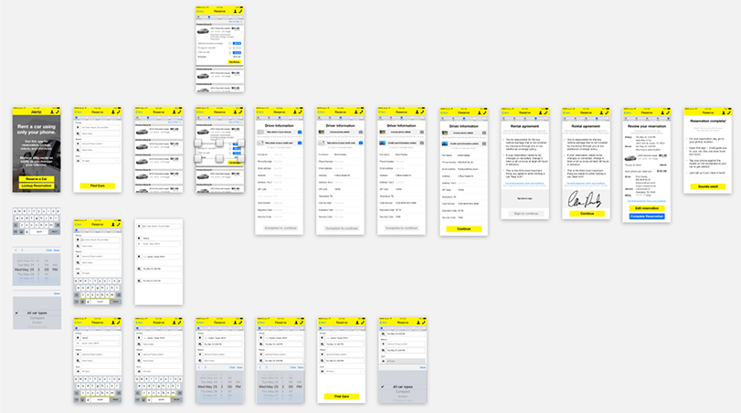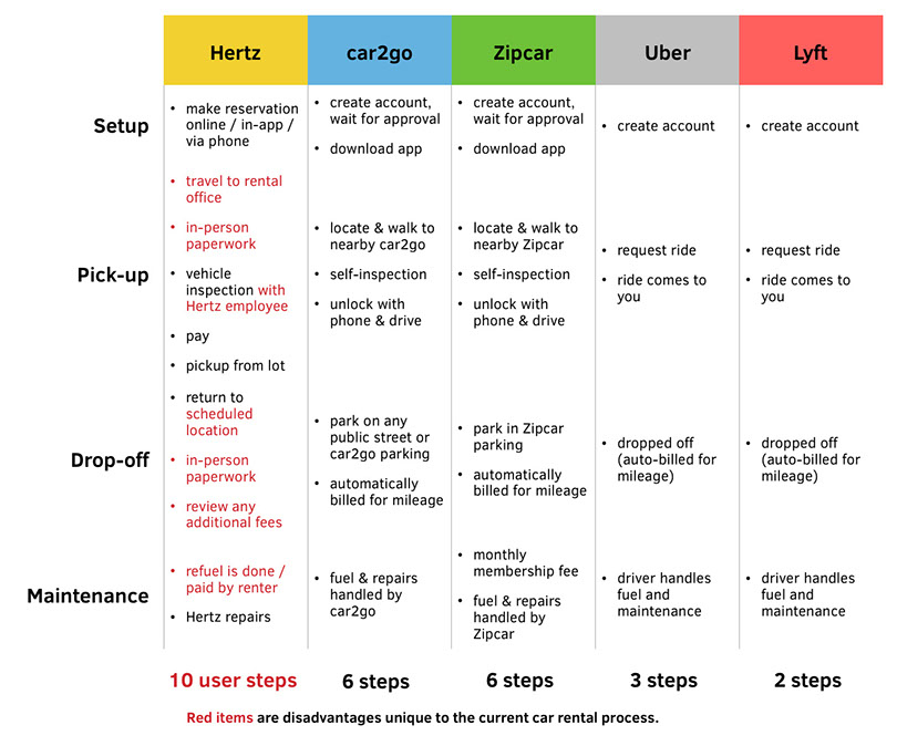 Competitive analysis of the Hertz, Uber, Zipcar, and Car2Go user flows made it clear that renting a car takes considerably more effort and paperwork than using any of the other services: