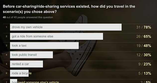 To get qualitative insight into how people use different transportation services, we conducted two online user surveys (a broader transportation survey, and a follow-up targeted at rental car users). The surveys revealed that most people didn't actually leave car rentals for the services Hertz expected, and a few key pain points came into focus.